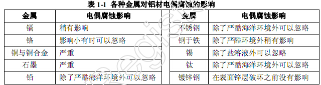 電偶腐蝕也是鋁的特征性的腐蝕形態,鋁的自然電位很負,當鋁與其他金屬接觸(或點接觸)時,鋁總是處于陽極氧化使其腐蝕加速。電偶腐蝕又稱雙金屬腐蝕,其腐蝕的嚴重程度是由兩個金屬在電位序中的相對位置決定的。他們的電位差愈大,則電偶腐蝕越嚴重,幾乎所有鋁合金都不能避免電偶腐蝕,表1-1給出了各種不同金屬對于鋁材電偶腐蝕的影響。