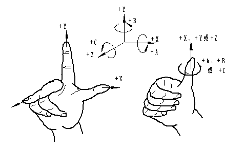 標(biāo)準(zhǔn)的機床坐標(biāo)系是一個右手笛卡兒直角坐標(biāo)系。圖中拇指、食指和中指分別代表X、Y、Z三個直線移動軸。圍繞X、Y、Z坐標(biāo)旋轉(zhuǎn)的旋轉(zhuǎn)坐標(biāo)分別用A、B、C表示,根據(jù)右手螺旋定則,大拇指的指向為X、Y、Z坐標(biāo)中任意軸的正向,則其余四指的旋轉(zhuǎn)方向即為旋轉(zhuǎn)坐標(biāo)A、B、C的正向。